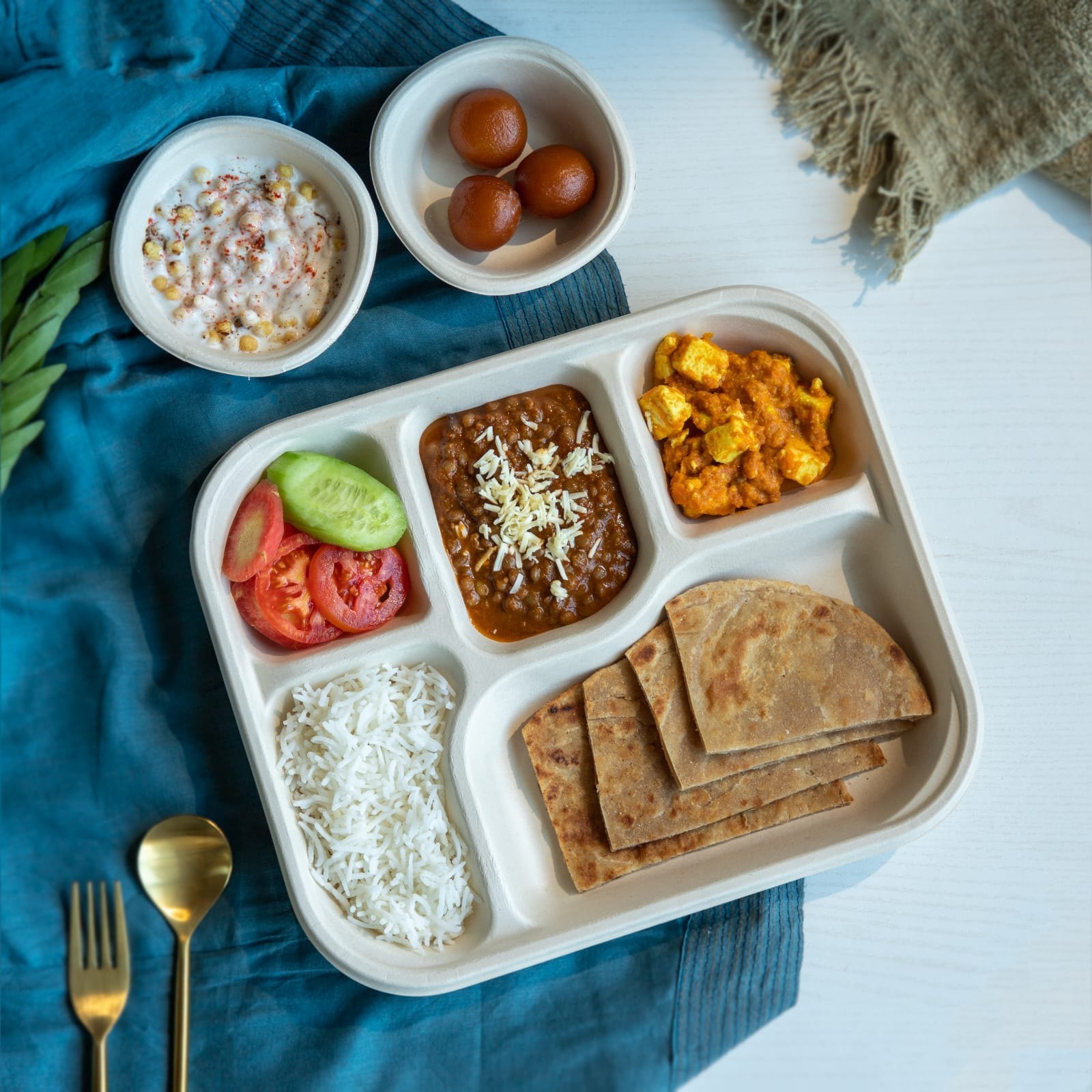 Durable and lightweight plates and multi-compartment thali ideal for serving meals, snacks, and takeout. Made from food-grade material, perfect for restaurants, parties, and daily use.