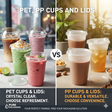 Premium PET and PP cups with secure lids, ideal for beverages and desserts, offering clarity, strength, leak resistance, and hygienic, convenient packaging for cafés, restaurants, and takeaway services.