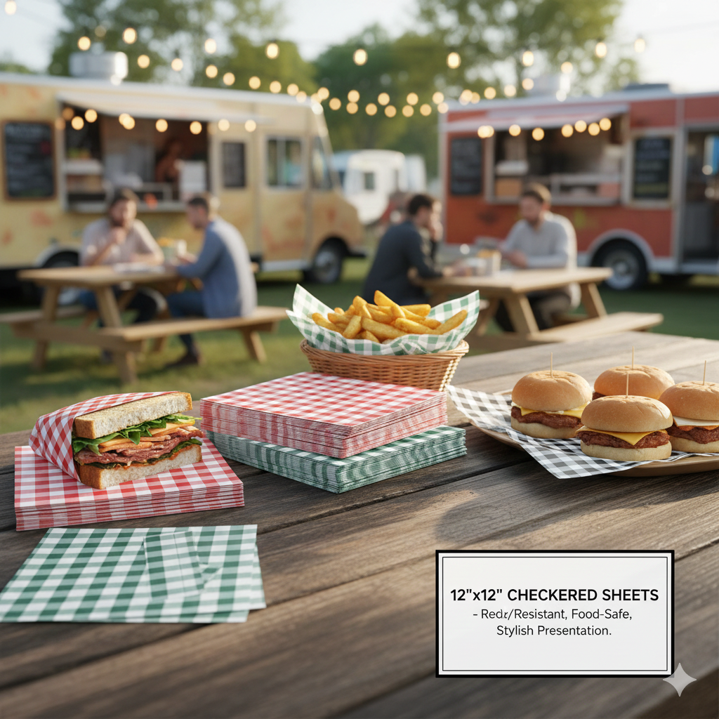 Our 12″ x 12″ Checkered Sheets in Red, Green, and Black are perfect for food presentation, wrapping sandwiches, lining baskets, or adding a decorative touch to platters. Made from high-quality, food-safe paper, these sheets are durable, grease-resistant, and ideal for restaurants, cafes, catering, and events. Bring a classic, colorful style to your food service while keeping items neat and hygienic.