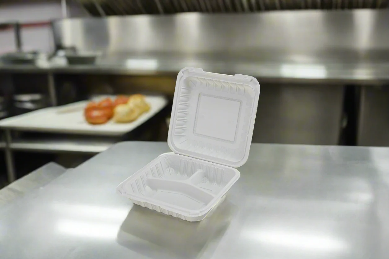 Our 8×8 3-Compartment MFPP Clamshell is a durable and eco-friendly container ideal for portioning meals, snacks, or takeout items into separate sections. Made from molded fiber/paper pulp (MFPP), it is compostable, microwave-safe, and a sustainable alternative to plastic containers. Perfect for restaurants, cafes, catering, and food delivery services, it combines convenience, organization, and environmental responsibility.